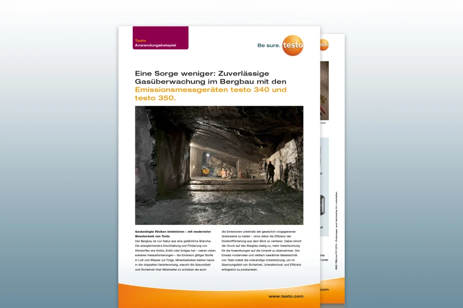 Использование передовых технологий измерения выбросов, таких как testo 340 и testo 350, обеспечивает безопасный и эффективный мониторинг концентрации газов, защиту здоровья сотрудников и соблюдение нормативов выбросов, одновременно оптимизируя добычу сырья. Встроенный термопарный датчик для измерения температуры до +1000 °C дополняет общую систему и обеспечивает комплексный контроль параметров безопасности и эксплуатации в горнодобывающей промышленности.