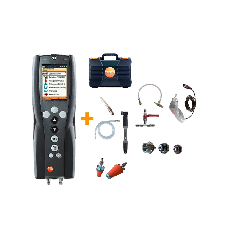 В комплект для газа и воды, помимо течеискателя testo 324, входят практичные аксессуары, такие как конический Y-образный разветвитель для параллельного измерения двух участков трубы, зонд высокого давления, тестовые заглушки, ступенчатые заглушки высокого давления и многое другое.